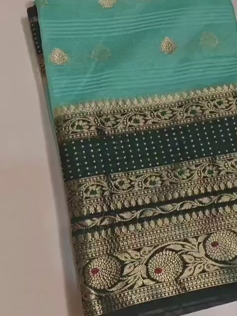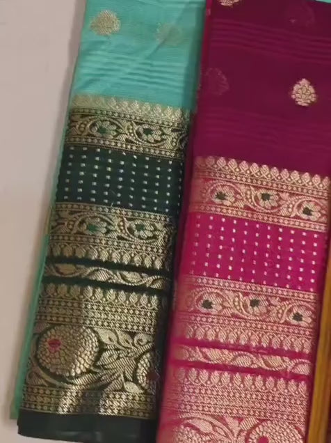 This Banarasi warm silk saree showcases soft check silk fabric with elegant luster and comfort. It features intricate designer buti motifs woven throughout the body, complemented by a refined Zari Mina Dar border that adds a touch of traditional grandeur. The contrast blouse piece and elaborate pallu weaving complete the sophisticated ensemble. Available in single and multiple lengths, this saree is perfect for festive occasions and formal events, blending heritage craftsmanship with a modern aesthetic.