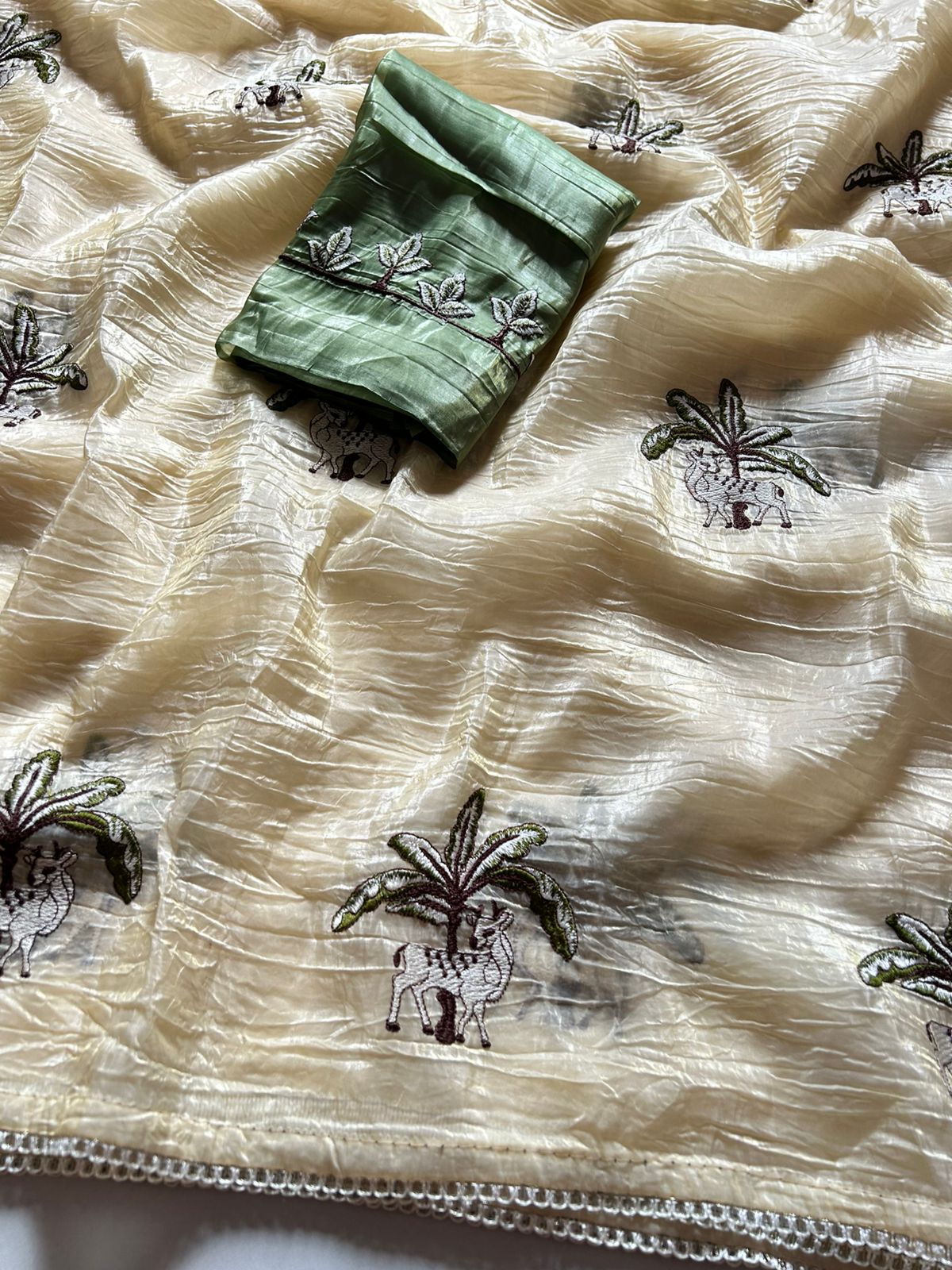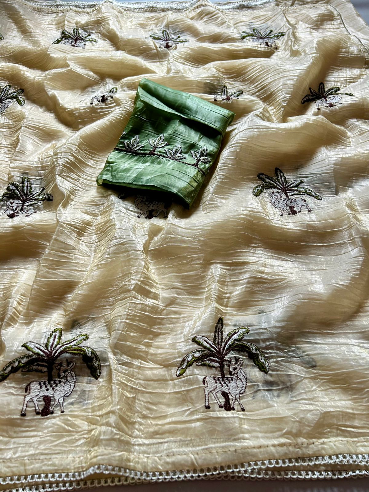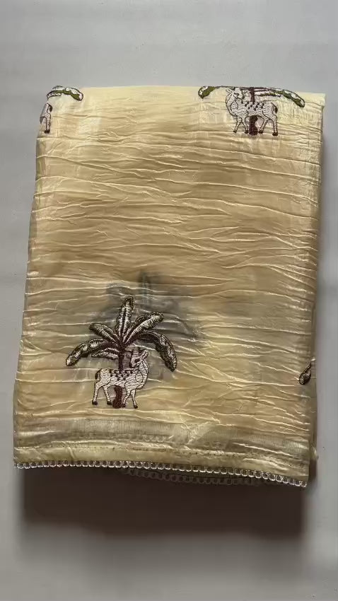 Elevate your ethnic wardrobe with this exquisite pure gold crush silk saree, crafted for the discerning wearer. The fabric drapes beautifully with an all-over embroidery design complemented by intricate cut work detailing that adds dimension and sophistication. The coordinating blouse features contrast embroidery work adorned with traditional butti patterns, creating a cohesive and refined ensemble. Perfect for weddings, celebrations, and special occasions where timeless elegance is paramount.